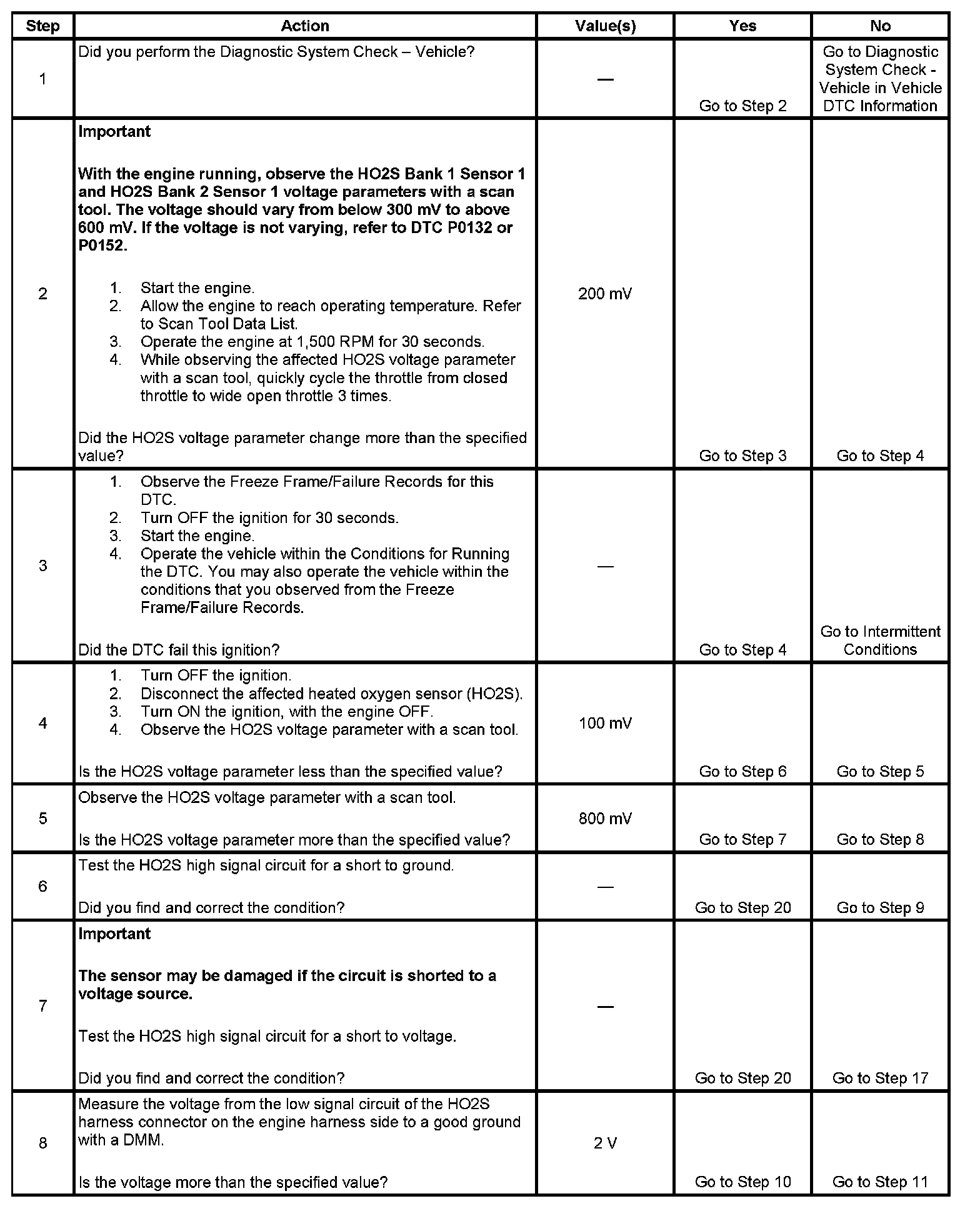 Heated oxygen sensors (HO2S) are used for fuel control and post catalyst monitoring. Each HO2S compares the oxygen content of the surrounding air with the oxygen content in the exhaust stream. The HO2S must reach operating temperature to provide an accurate voltage signal. Heating elements inside the HO2S minimize the time required for the sensors to reach operating temperature. The engine control module (ECM) supplies the HO2S with a reference, or bias, voltage of about 450 mV. When the engine is first started the ECM operates in Open Loop, ignoring the HO2S voltage signal. Once the HO2S reaches operating temperature and Closed Loop is achieved, the HO2S generates a voltage within a range of 0-1,000 mV that fluctuates above and below bias voltage. High HO2S voltage indicates a rich exhaust stream. Low HO2S voltage indicates a lean exhaust stream. If the ECM detects an HO2S voltage that stays below a specified value, DTC P0137 sets for HO2S bank 1 sensor 2 or DTC P0157 sets for HO2S bank 2 sensor 2.