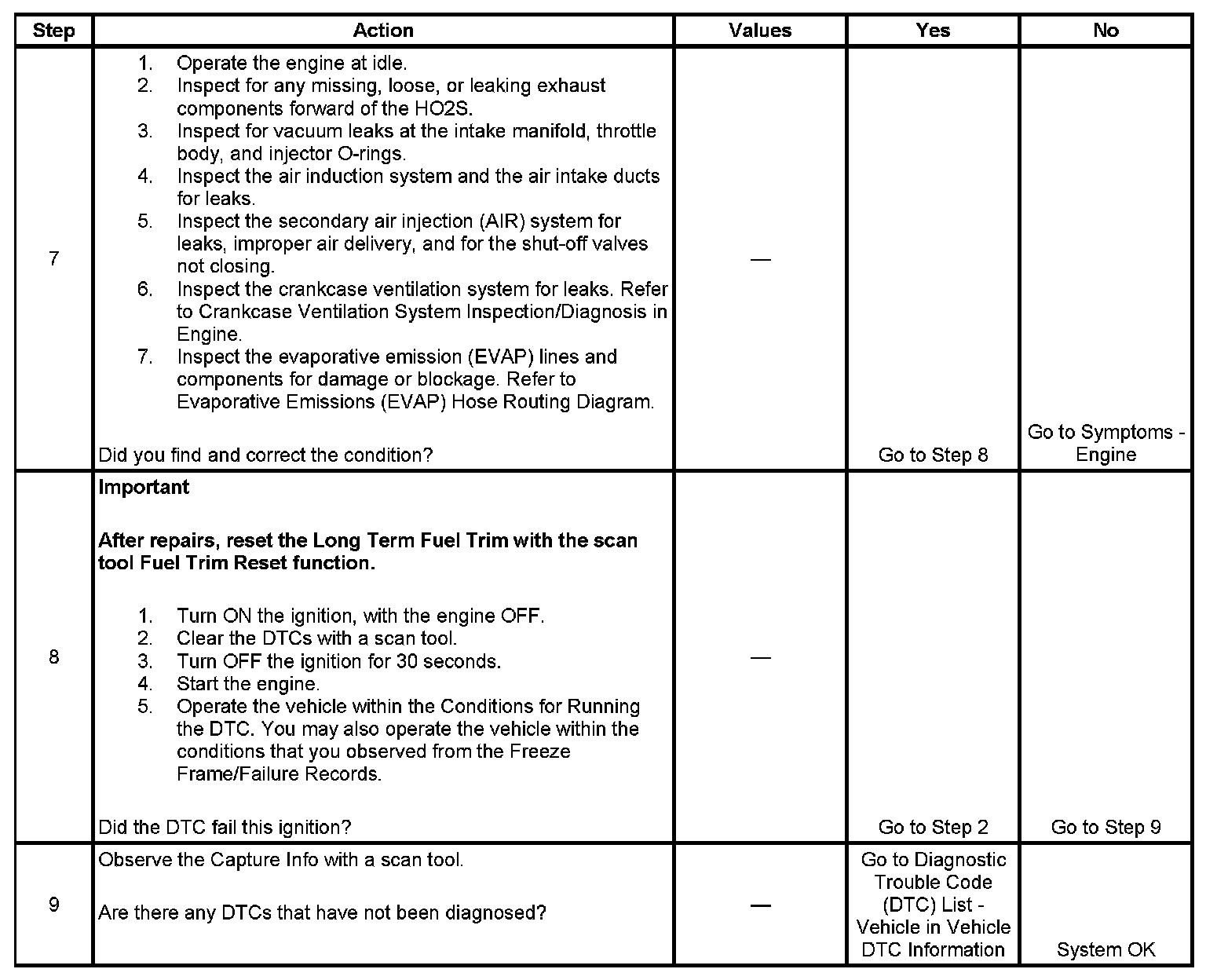 The powertrain control module (PCM) controls the air/fuel metering system in order to provide the best possible combination of driveability, fuel economy, and emission control. Fuel delivery is controlled differently during Open and Closed Loop. During Open Loop, the PCM determines fuel delivery based on sensor signals without oxygen sensor input. During Closed Loop, the PCM adds oxygen sensor inputs and level of purge to calculate short and long term fuel trim adjustments. If the oxygen sensors indicate a lean condition, fuel trim values will be above 0 percent. If the oxygen sensors indicate a rich condition, fuel trim values will be below 0 percent. The values for the short term fuel trim change rapidly in response to the heated oxygen sensor (HO2S) voltage signals. Long term fuel trim makes course adjustments in order to maintain an air/fuel ratio of 14.7:1. A block of cells contain information arranged in combinations of engine RPM and engine load for a full range of vehicle operating conditions. The long term fuel trim diagnostic is based on an average of cells currently being used. The PCM selects the cells based on the engine speed and engine load. If the PCM detects an excessively lean condition, DTC P0171 or P0174 sets.