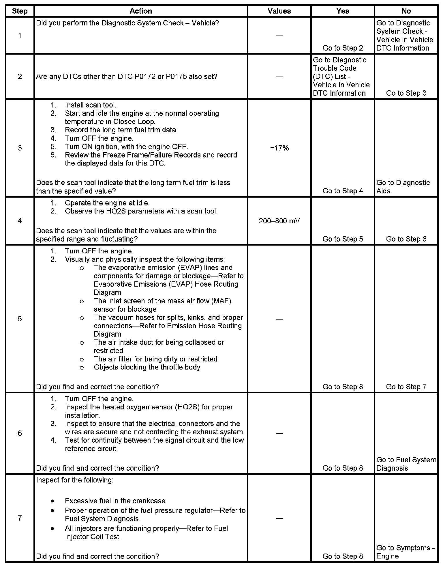 The powertrain control module (PCM) controls the air/fuel metering system in order to provide the best possible combination of driveability, fuel economy, and emission control. Fuel delivery is controlled differently during Open and Closed Loop. During Open Loop, the PCM determines fuel delivery based on sensor signals without oxygen sensor input. During Closed Loop, the PCM adds oxygen sensor inputs and level of purge to calculate short and long term fuel trim adjustments. If the oxygen sensors indicated a lean condition, fuel trim values will be above 0 percent. If the oxygen sensors indicate a rich condition, fuel trim values will be below 0 percent. The values for the short term fuel trim change rapidly in response to the heated oxygen sensor (HO2S) voltage signals. Long term fuel trim makes coarse adjustments in order to maintain an air/fuel ratio of 14.7:1. A block of cells contain information arranged in combinations of engine RPM and engine load for a fuel range of vehicle operating conditions. The long term fuel trim diagnostic is based on an average of cells currently being used. The PCM selects the cells based on the engine speed and engine load. The fuel trim diagnostic will conduct a test to determine if a rich failure actually exists, or if excessive vapor from the evaporative emission (EVAP) canister is causing a rich condition. If the PCM detects an excessively rich condition, DTC P0172 or P0175 sets.