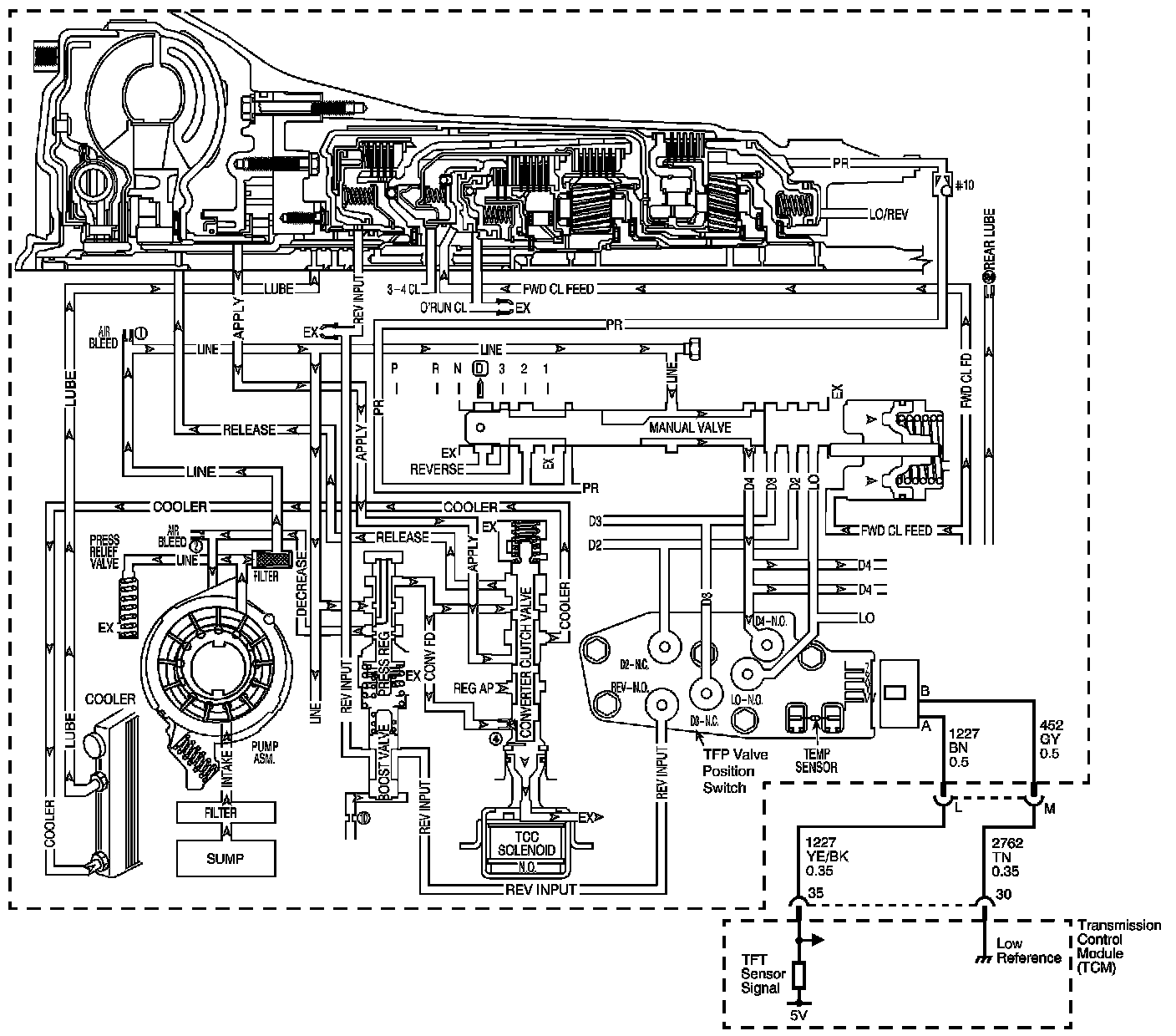 The flow of transmission fluid starts in the bottom pan and is drawn through the filter, control valve body assembly, transmission case and into the oil pump assembly. The oil pump assembly pressurizes the fluid and directs it to the pressure regulator valve where it becomes the main supply of fluid to the various components and hydraulic circuits in the transmission. Hot fluid exiting the torque converter flows through the converter clutch apply valve and into the transmission cooler lines to the oil cooler located in the vehicle radiator, and auxiliary cooler if equipped. From the cooler, fluid returns to cool and lubricate the front of the transmission. In forward drive ranges, D4 fluid from the manual valve is routed through an orificed cup plug in the rear of the transmission case to feed the rear lube fluid circuit.