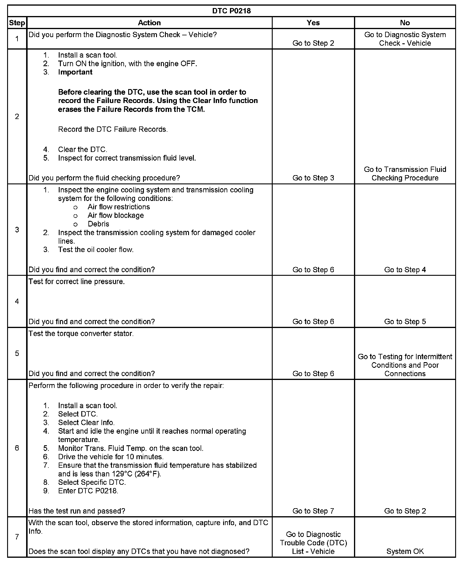 When the transmission control module (TCM) detects a high transmission fluid temperature (TFT) for a long period of time, then DTC P0218 sets. DTC P0218 is a type C DTC.