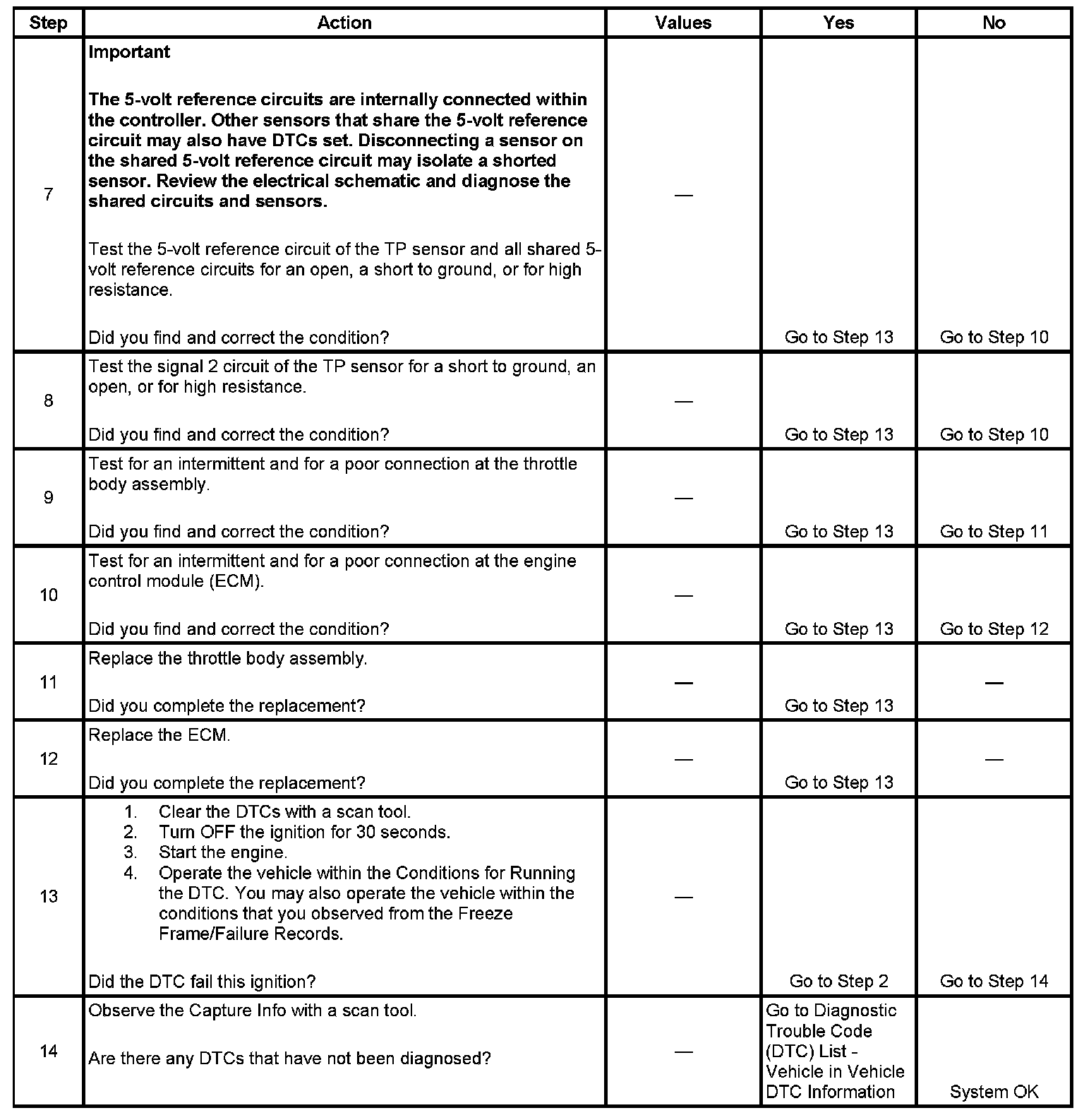 6. This step tests the signal 2 circuit of the TP sensor. If the TP sensor 2 voltage parameter is not 4.8-5.2 volts, test for a condition in the signal 2 circuit.
