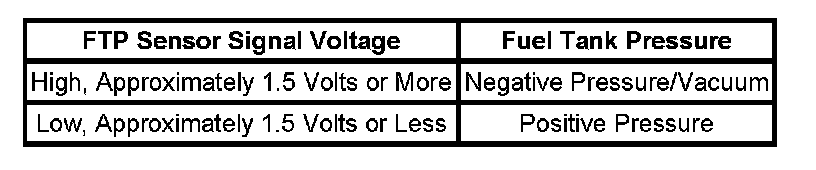 The table illustrates the relationship between the FTP sensor signal voltage and the EVAP system pressure/vacuum.