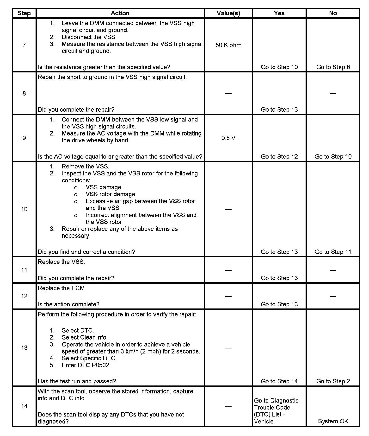 ^ The ECM stores DTC P0502 in ECM history during the second consecutive trip in which the Conditions for Setting the DTC are met.