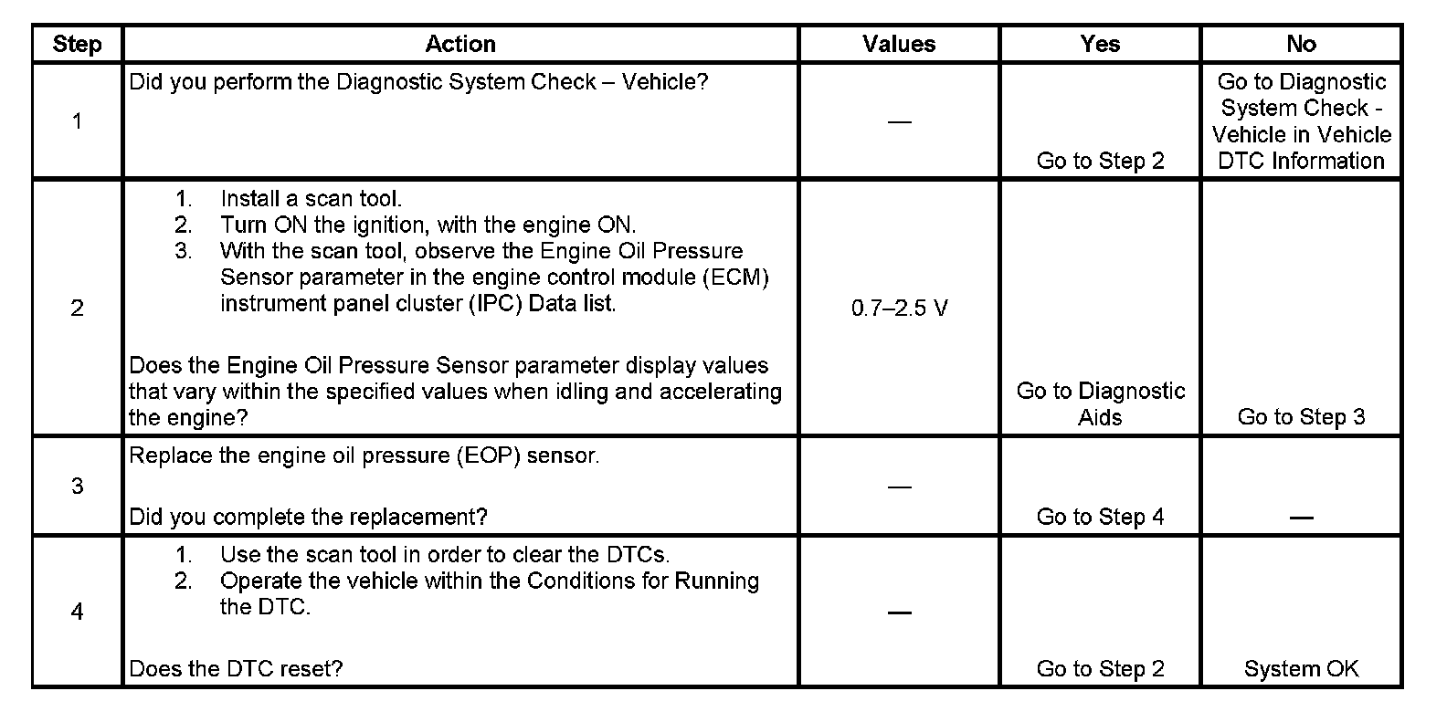 The ECM does not detect a change in the engine oil pressure of at least 34.5 kPa (5 psi) over a predetermined variance of the engine speed.