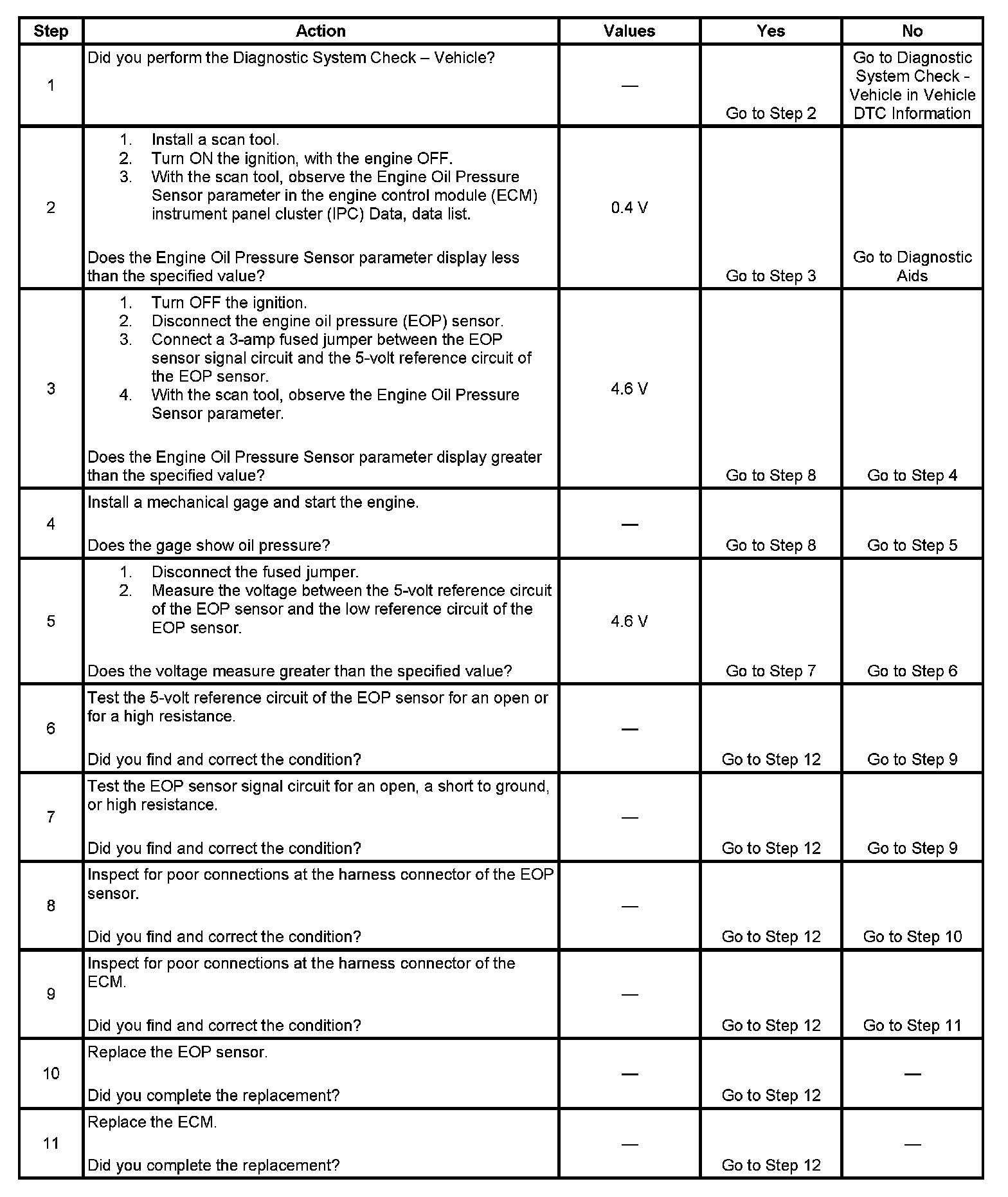 - The ECM detects that the EOP sensor signal circuit is less than 0.4 volts.