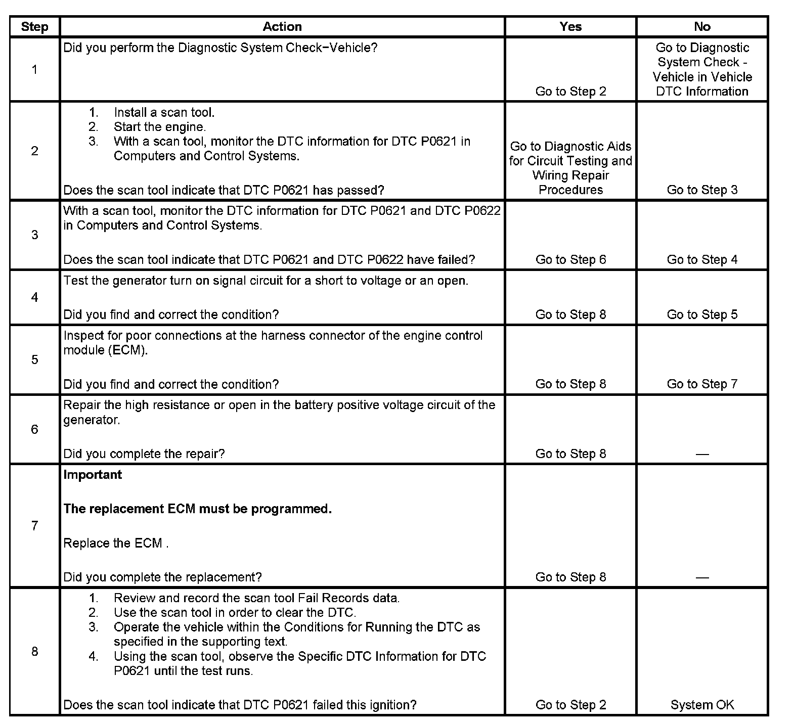 The ECM monitors the state of the generator turn on signal circuit. The ECM should detect a low generator turn on signal circuit voltage when the key is ON and the engine is OFF, or when the charging system malfunctions. With the engine running, the ECM should detect a high generator turn on signal circuit. The ECM performs key ON and RUN tests to determine the status of the generator turn on signal circuit. During the key ON test, if the ECM detects a high generator turn on signal circuit voltage, DTC P0621 will set. DTC P0621 will also set if, during the RUN test, the ECM detects a low generator turn on signal circuit. When the DTC sets, the ECM will send a serial data message to the drivers information center (DIC) to display a warning message.