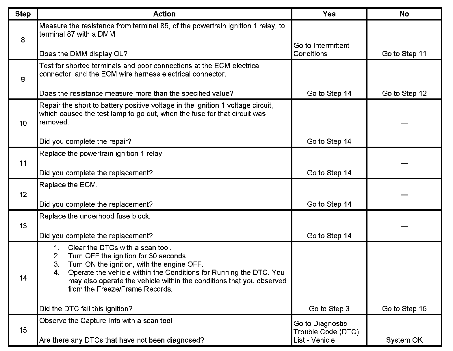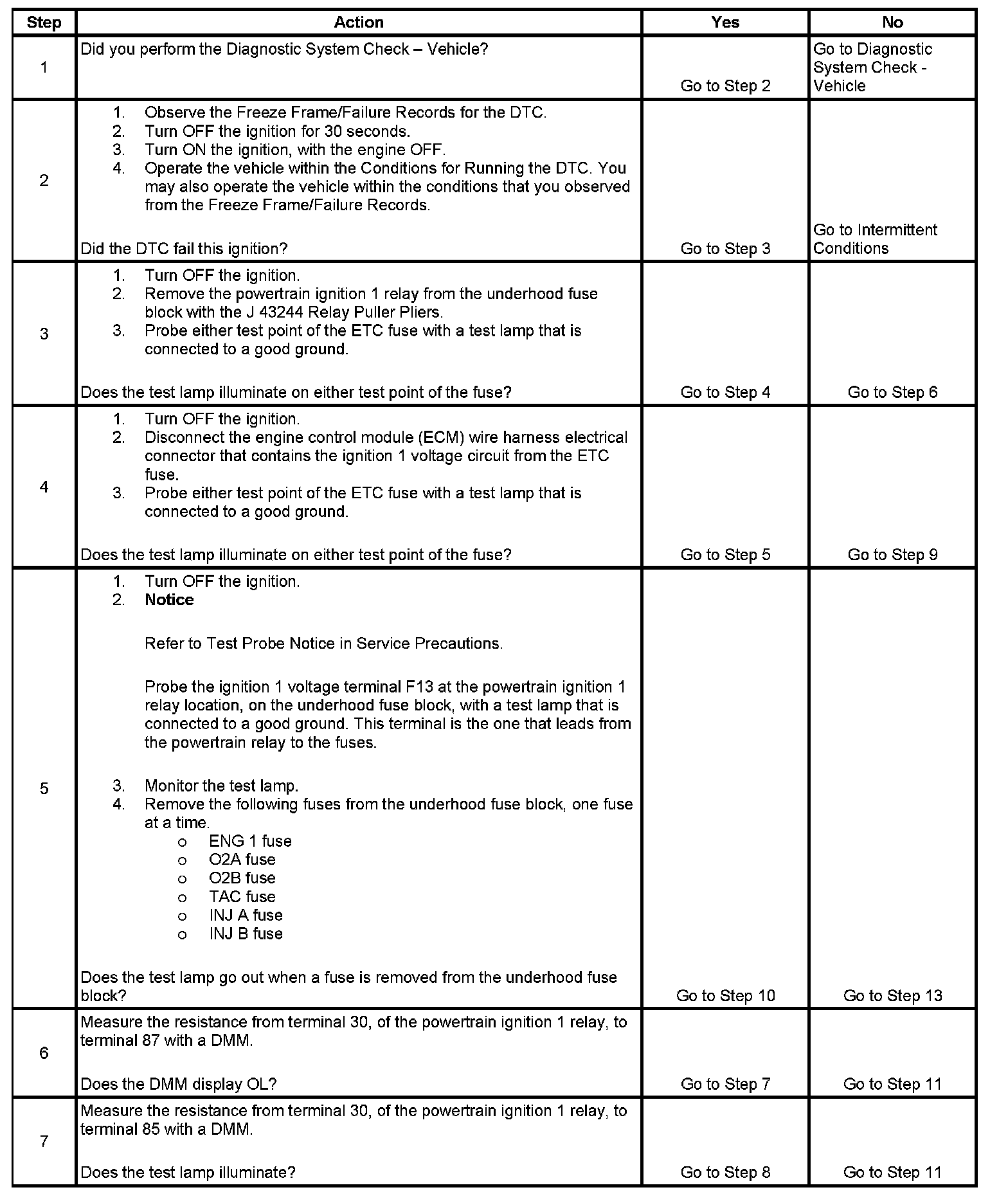 The powertrain ignition 1 relay is a normally open relay. The relay armature is held in the open position by spring tension. Battery positive voltage is supplied directly to the relay coil and the armature contact at all times. The engine control module (ECM) supplies the ground path to the relay coil control circuit via an internal integrated circuit called an output driver module (ODM). When the ECM commands the powertrain ignition 1 relay ON, ignition 1 voltage is supplied to the ECM through the ETC fuse in the underhood fuse block. The ignition 1 voltage input to the ECM provides the ignition power for the electronic throttle control (ETC) circuitry, and is also used to confirm that the powertrain ignition 1 relay has closed. This DTC will set when the ECM detects more than 2 volts on the ETC ignition 1 voltage circuit to the ECM, after the ignition switch is turned OFF. DTC P0690 indicates a short to battery positive voltage, on the ETC ignition 1 voltage circuit to the body control module (BCM).