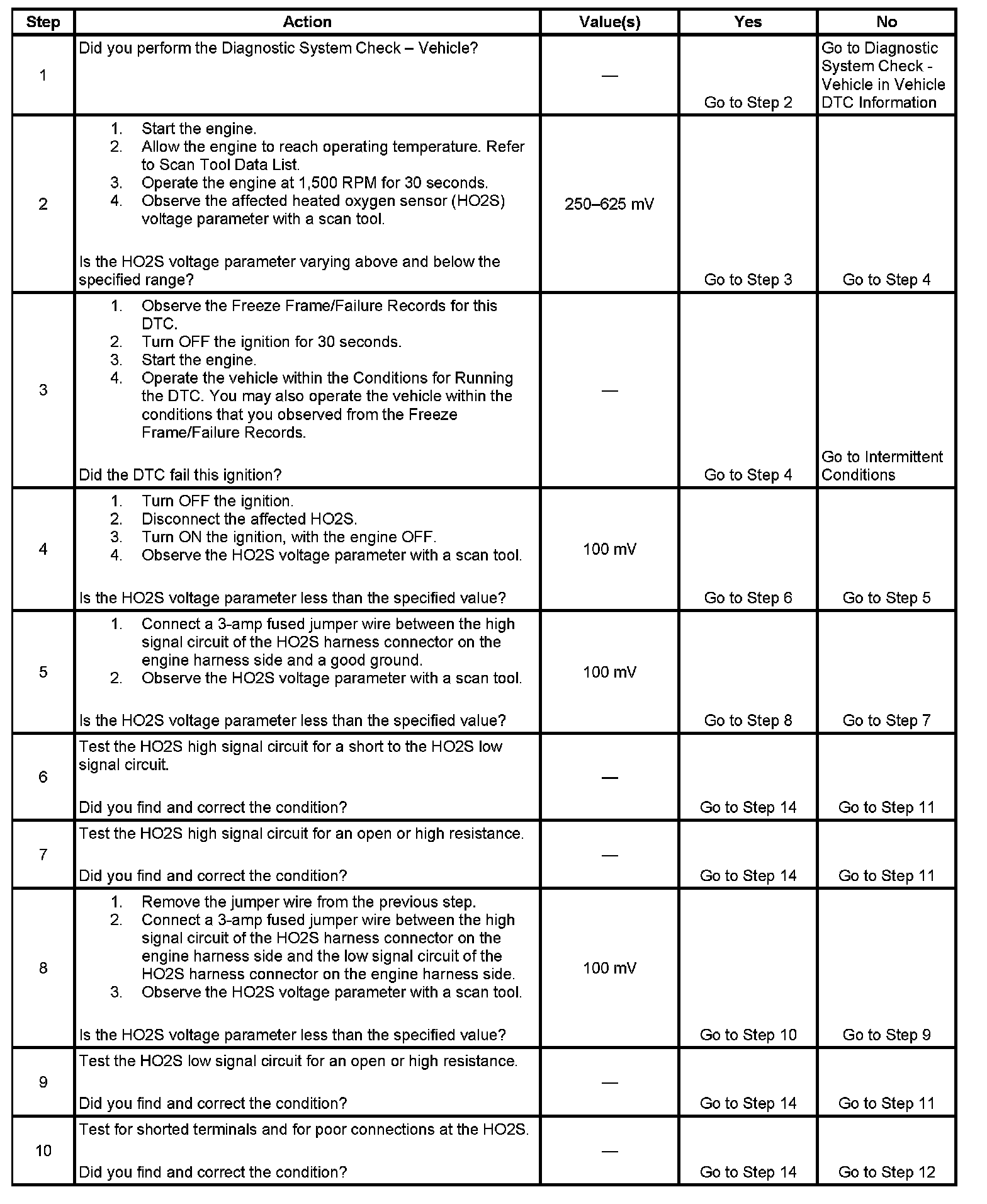 Heated oxygen sensors (HO2S) are used for fuel control and post catalyst monitoring. Each HO2S compares the oxygen content of the surrounding air with the oxygen content in the exhaust stream. The HO2S must reach operating temperature to provide an accurate voltage signal. Heating elements inside the HO2S minimize the time required for the sensors to reach operating temperature. The engine control module (ECM) supplies the HO2S with a reference, or bias, voltage of about 450 mV. When the engine is first started the ECM operates in Open Loop, ignoring the HO2S voltage signal. Once the HO2S reaches operating temperature and Closed Loop is achieved, the HO2S generates a voltage within a range of 0-1,000 mV that fluctuates above and below bias voltage. High HO2S voltage indicates a rich exhaust stream. Low HO2S voltage indicates a lean exhaust stream. This diagnostic will only run once per ignition cycle. The ECM monitors the number of rich-to-lean and lean-to-rich transitions. If the ECM detects that the number of transitions were less than a specified value, DTC P1133 sets for HO2S bank 1 sensor 1, or DTC P1153 sets for HO2S bank 2 sensor 1.