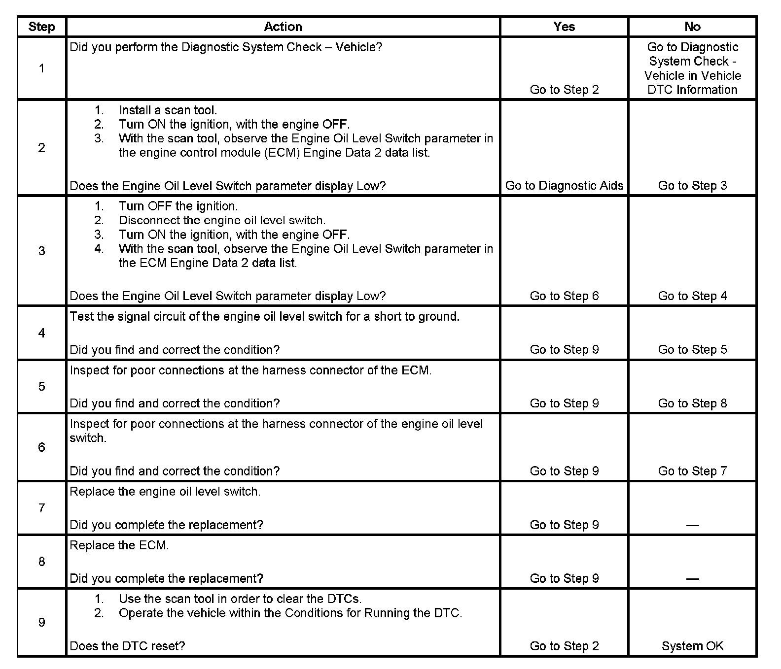 The engine oil level switch grounds when the oil level is at the proper level. With the ignition ON, and the engine OFF, the engine control module (ECM) should detect full oil level or a low voltage on the signal circuit of the engine oil level switch. When the engine speed is at least 2,000 RPM, the ECM should detect a transition from a low voltage to a high voltage on the signal circuit of the engine oil level switch.
