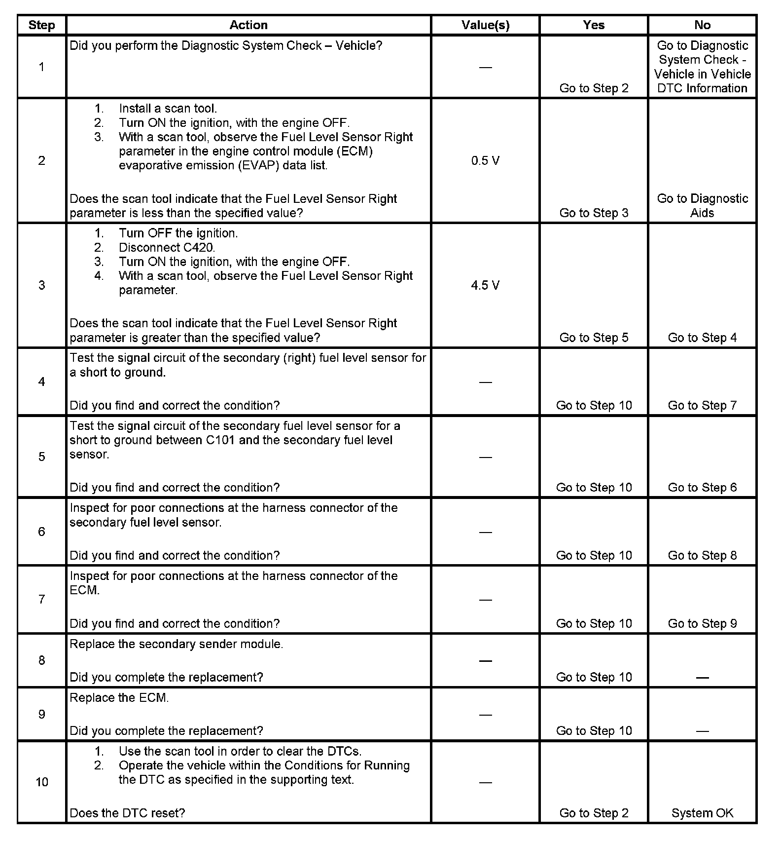 The primary (left) fuel level sender and the secondary (right) fuel level sender change resistance in response to the fuel level. The engine control module (ECM) monitors the signal circuit of the primary (left) fuel level sender and the signal circuit of the secondary (right) fuel level sender in order to determine the fuel level. When the fuel tanks are full, the resistances of both fuel level senders are high, and the ECM senses a high signal voltage on both the signal circuit of the primary (left) fuel level sender and the signal circuit of the secondary (right) fuel level sender. When the fuel tanks are empty, the resistances of the fuel level senders are low, and the ECM senses a low signal voltage. The ECM uses the signal circuits of the primary (left) fuel level sender and the secondary (right) fuel level sender in order to calculate the percentage of remaining fuel in the tanks. The ECM sends the fuel level percentage via the class 2 serial data circuit to the instrument cluster in order to control the fuel gage. The fuel level information is also used for misfire and evaporative emission (EVAP) diagnostics. This diagnostic tests for a lower than normal secondary fuel level sender signal.