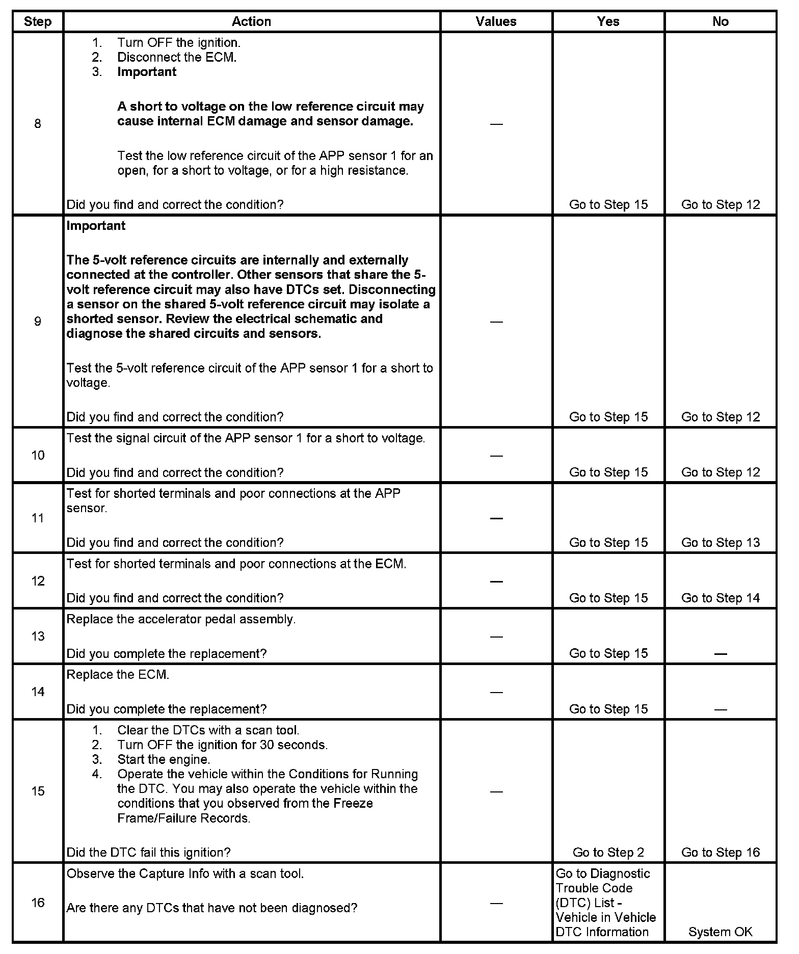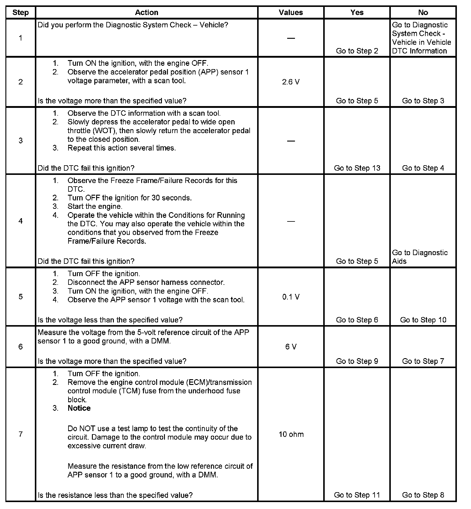 3. This step tests the internal circuits of the APP sensor 1 throughout its range of motion. If this DTC sets when slowly moving the pedal from the rest position to wide open throttle (WOT), replace the APP assembly for an internal fault.