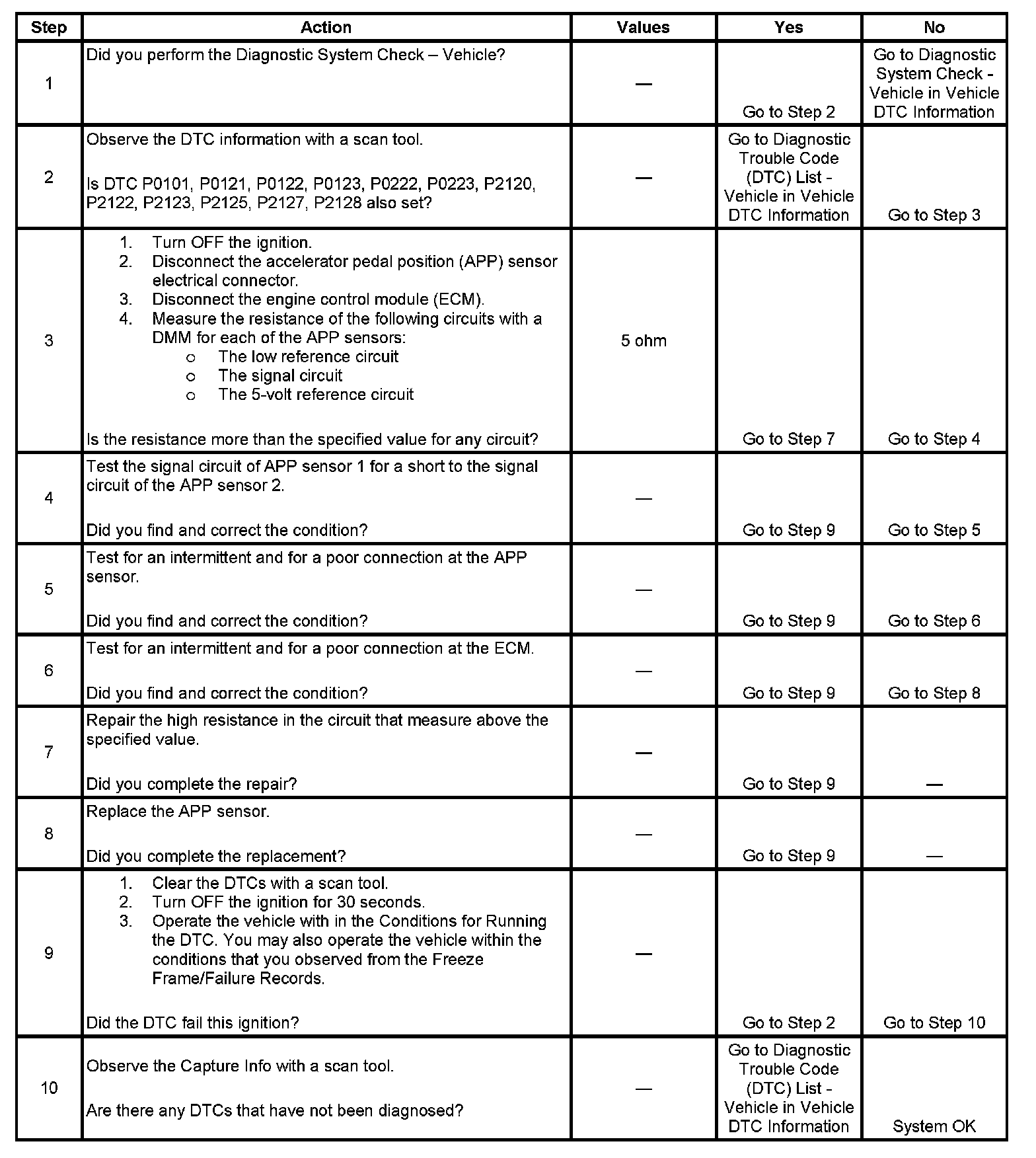 The accelerator pedal position (APP) sensor is made up of 2 sensors that are housed inside one assembly. The engine control module (ECM) supplies a separate 5-volt reference circuit and a low reference circuit for each of the sensors. The 5-volt reference for APP sensor 1 is supplied from the same source in the ECM as the 5-volt reference for the mass air flow (MAF) sensor and the fuel tank pressure (FTP) sensor. The 5-volt reference voltage for all of the sensors is supplied on separate ECM terminals, but the terminals are connected internally to a voltage supply. The APP sensor 1 sends a signal from the sensor to the ECM indicating the accelerator pedal position. The ECM actuates the throttle plates based on this information. If the ECM detects that the APP sensors are not within a predicted value from each other, DTC P2138 sets.
