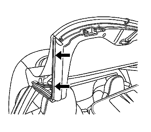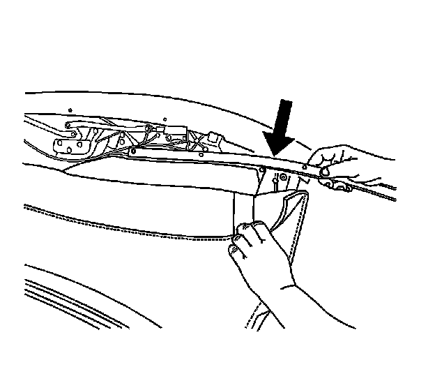 33. Manually place top in closed position. Observe headliner as top header approaches header. If headliner strings are binding or stretching, stop. Check strings for proper routing.