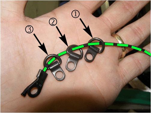 For illustration purposes, the third D-ring and metal key ring are shown outside the vehicle. When actually doing this step, the end eyelet (hanging down in the above graphic) and the second D-ring will already be attached.
