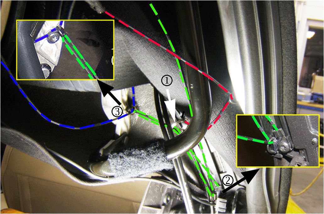 Prior to securing the rivet, ensure that the short headliner string (shown in blue above) is routed through the P-clip and that the D-ring and P-clip are in the proper orientation. The P-clip should point to the outside of the vehicle and the D-ring should point forward.