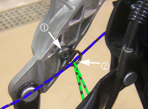 27. Route the anti-glare cover string (shown in red above) under the #5 bow link arms, through the eyelet on the #5 bow (right arrow), through the metal key ring (lower arrow) and then attach the screw (1) holding the end eyelet to the rear side rail, on the right and left side.