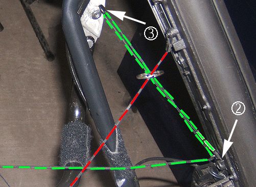 21. Attach the second D-ring and the end eyelet of the string to the bottom screw location of the headliner retainer bracket (position 2 shown above), on the right and left side.