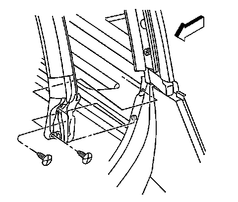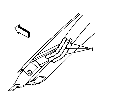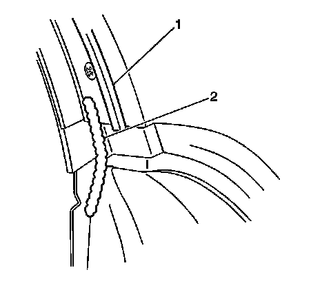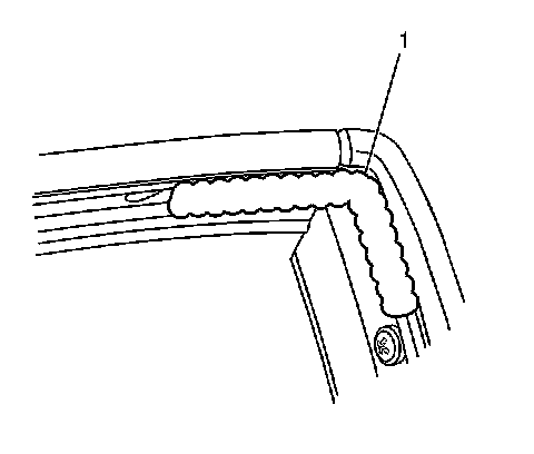1. Apply a 50 mm (2 in) bead of sealant (1) GM P/N 12345097, or equivalent, down the middle of both the weatherstrip retainers at the upper rear corner of the door opening.