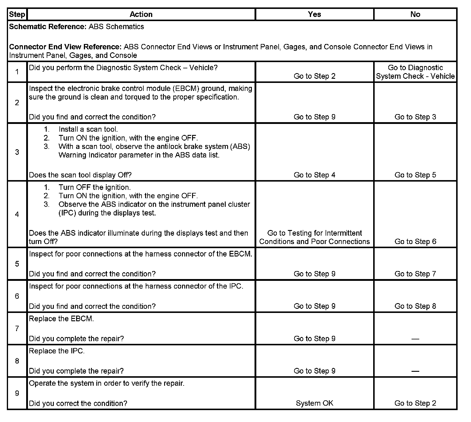 The instrument cluster controls the operation of the antilock brake system (ABS) indicator. The electronic brake control module (EBCM) reports the desired status of the ABS indicator via serial data messages. The ABS indicator signal circuit is a back-up reporting circuit to the serial data messages. The EBCM supplies ground through the circuit when the ABS is operating properly. When there is a problem with ABS that should turn on the ABS indicator, the EBCM opens the ABS indicator signal circuit. If there is a problem with the ABS serial data messages, the instrument cluster uses the ABS indicator signal to determine if the ABS indicator should be illuminated. Using the serial data messages and back-up circuit, the instrument cluster decides whether to turn on the ABS indicator.