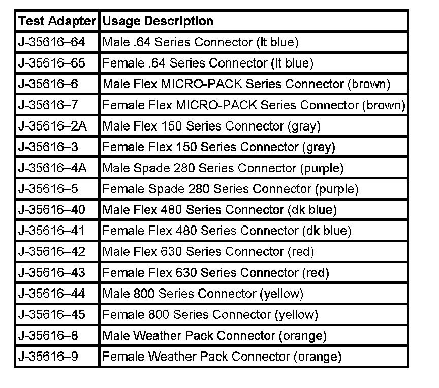 NOTE: Do not insert test equipment probes into any connector or fuse block terminal. The diameter of the test probes will deform most terminals. A deformed terminal can cause a poor connection, which can result in system failures. Always use the J 35616-B Connector Test Adapter Kit or the J 42675 Flat Wire Probe Adapter Kit in order to frontprobe terminals. Do not use paper clips or other substitutes as they can damage terminals and cause incorrect measurements.