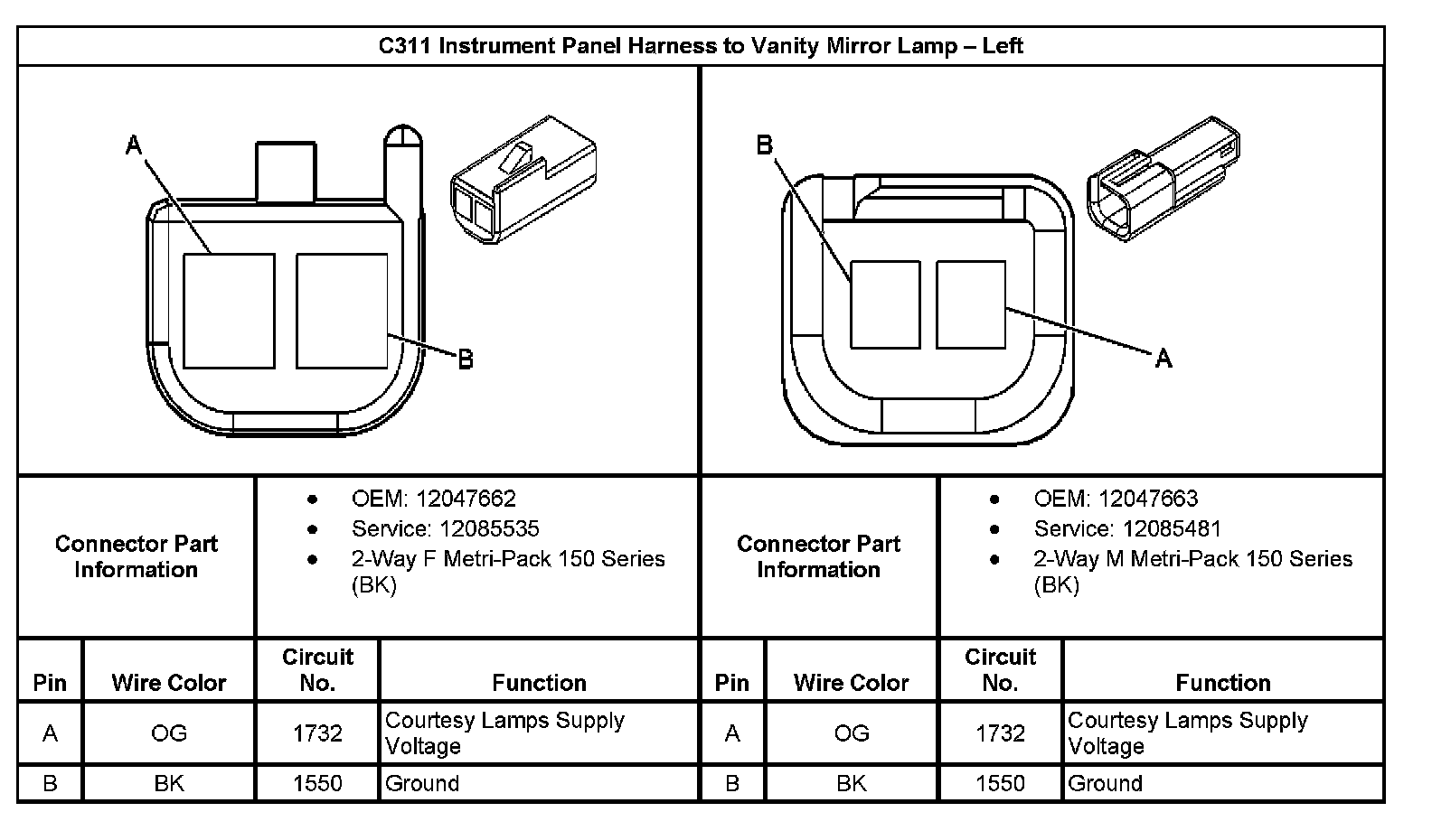 C311 Instrument Panel Harness To Vanity Mirror Lamp - Left: