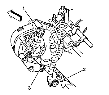3. Remove the engine wiring harness generator lead nut (3) and lead.