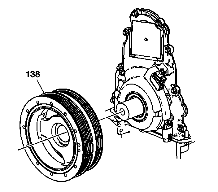 ^ For manual transmission applications, note the position of the crankshaft balancer before removal. The balancer does not use a key or keyway for positioning. Mark or scribe the end of the crankshaft and the balancer before component removal. The crankshaft balancer must be installed to the original position. If replacing the crankshaft balancer, note the location of any existing balance weights, if applicable. Crankshaft balance weights must be installed into the new balancer in the same location as the old balancer. A properly installed balance weight will be either flush or below flush with the face of the balancer.