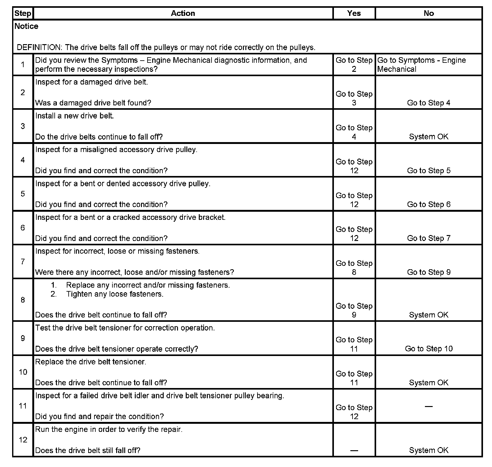 An extra load that is quickly applied or released by an accessory drive component may also cause the drive belts to fall off. Verify that the accessory drive components are operating properly.