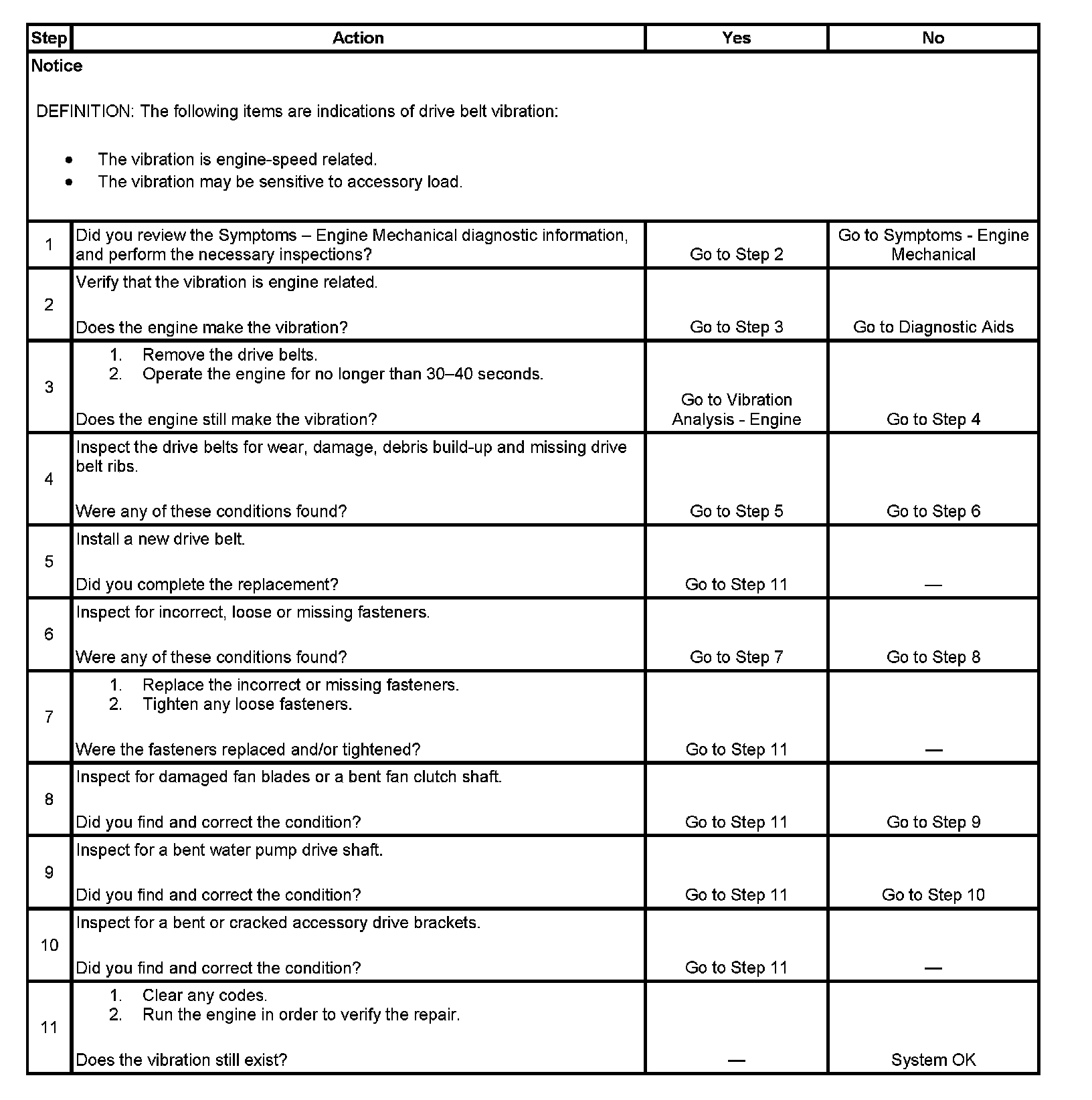 3. This test is to verify that the drive belts or accessory drive components may be causing the vibration. Remove the drive belts and operate the engine for a few seconds, this will verify if the vibration is related to the drive belts or not. With the drive belts removed the water pump will not operate and the engine may overheat. Also diagnostic trouble codes (DTCs) may set when the engine is operated with the drive belts removed.