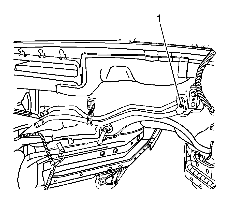 7. Remove the heater pipe assembly to heater core retaining bolt (1).