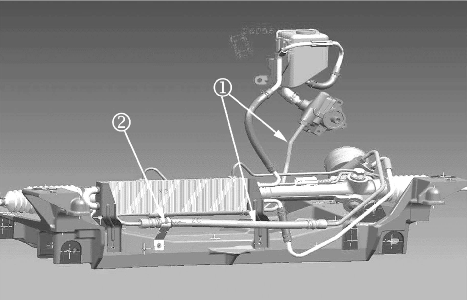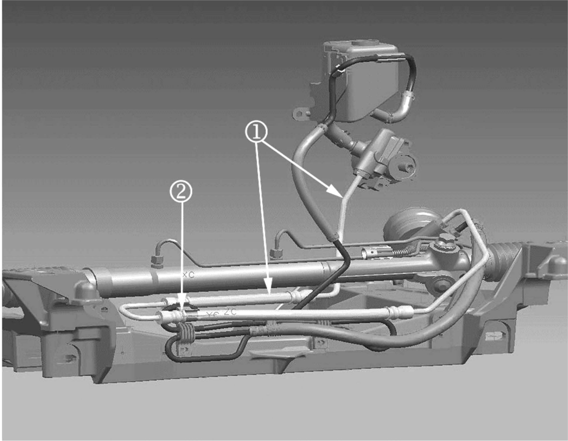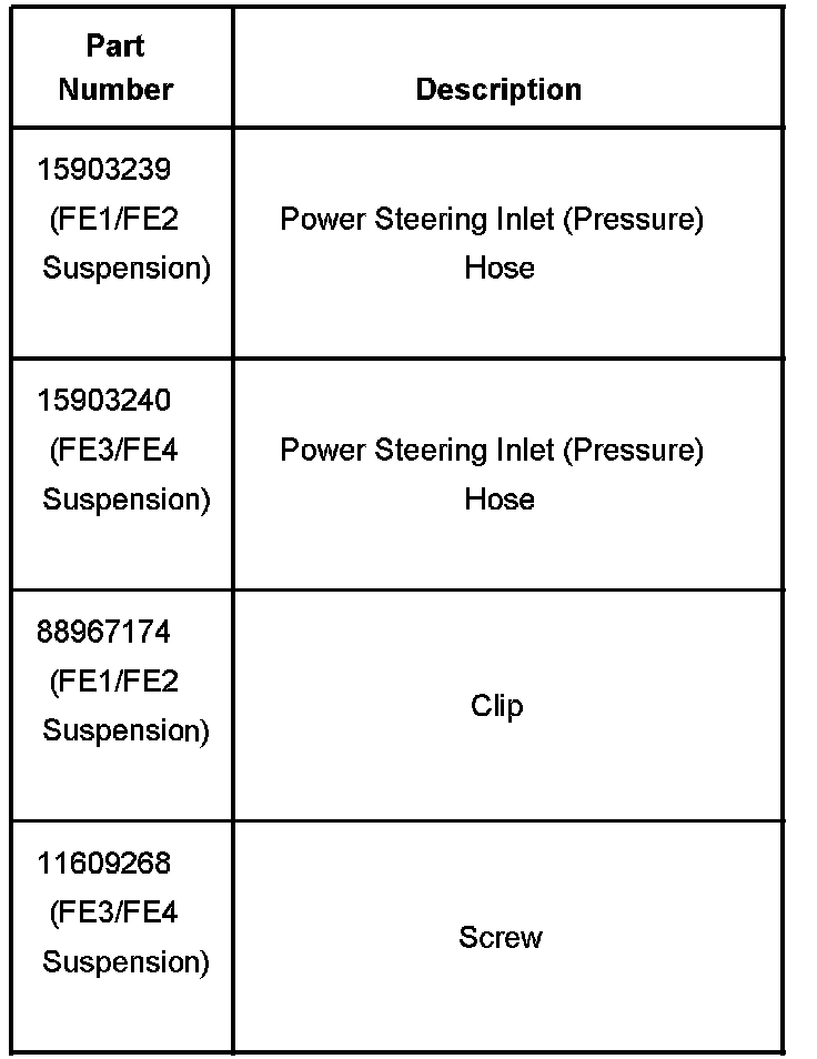 For vehicles with either FE1 or FE2 suspension, a retaining clip, P/N 88967174, is also required. After installing the new hose (1), attach the clip (2) to the hose just before the crimp. Secure the other end of the clip to the existing power steering return line.