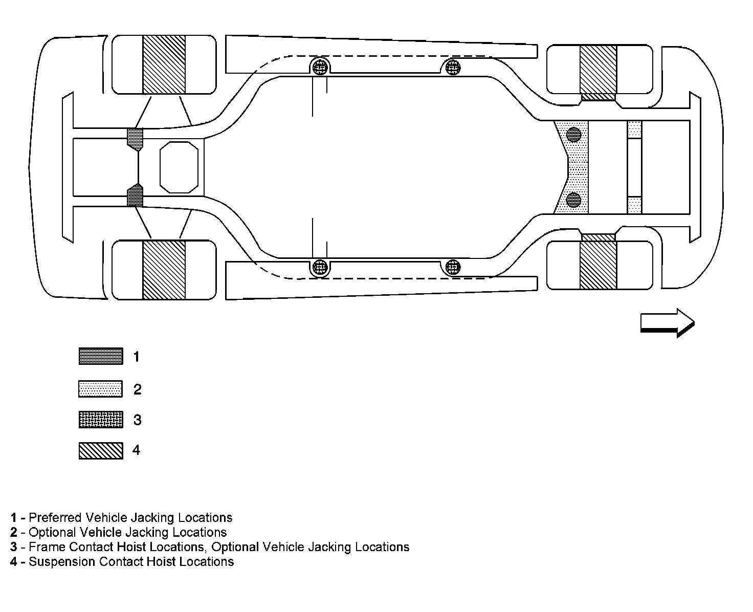 - Make sure the jack stand lift pads span at least 2 suspension crossmember ribs (1).