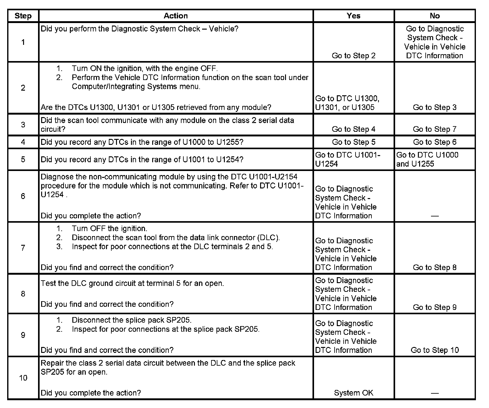 10. An open in the class 2 serial data circuit between the DLC and splice pack SP205 will prevent the scan tool from communicating with any module on the class 2 network. This condition will not set a DTC.