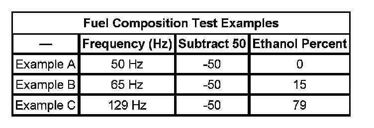 2. Subtract 50 from the reading on the DMM in order to obtain the percentage of alcohol in the fuel sample. Refer to the examples in the Fuel Composition Test Examples table.