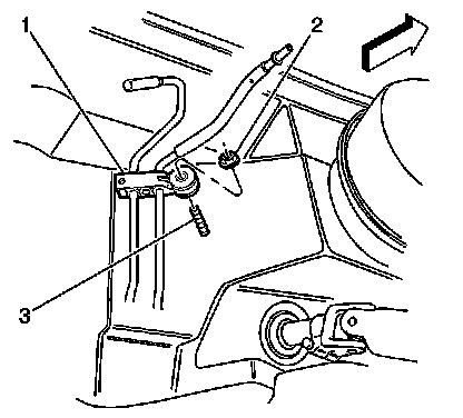 6. Disconnect the chassis fuel and evaporative emission (EVAP) pipe retainer (1) from the upper front of dash mounting stud (3).