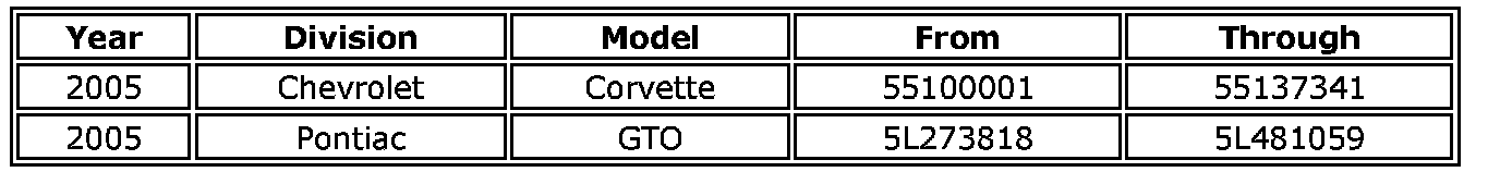Involved are all 2005 model year Chevrolet Corvette and Pontiac GTO vehicles, equipped with a 6.0L V8 (RPO LS2 - VIN U) engine and built within the VIN breakpoints shown.