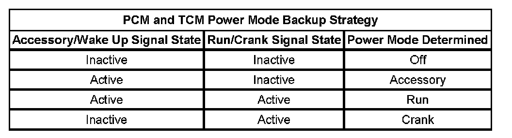The PCM and TCM remain in the last known power mode state until it can determine its backup system power mode based on their discrete Accessory/Wake up and Run/Crank signal inputs.