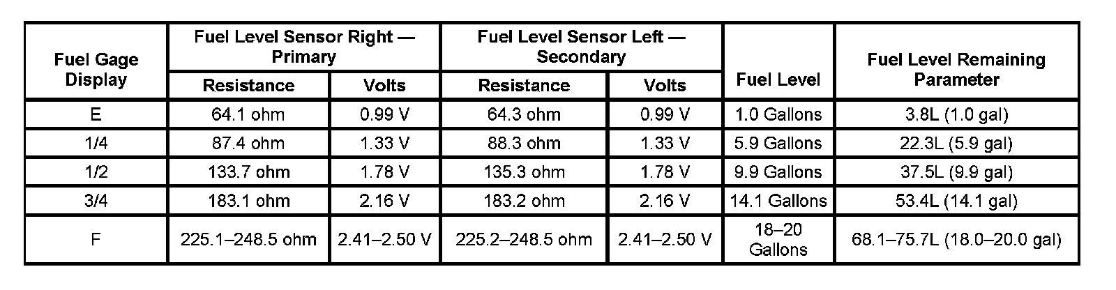 The information in the table is intended for use with the J 33431-C Signal Generator and Instrument Panel Tester. The fuel level sensor values represent the test values to be used on the Signal Generator to drive the fuel gage display to the indicated positions. Vehicles that require more than one fuel level sensor calculate gage position from many possible resistance combinations of fuel levels between the two tanks. Therefore, the values in the table may not correlate directly to readings taken from the vehicle primary or secondary sending units.