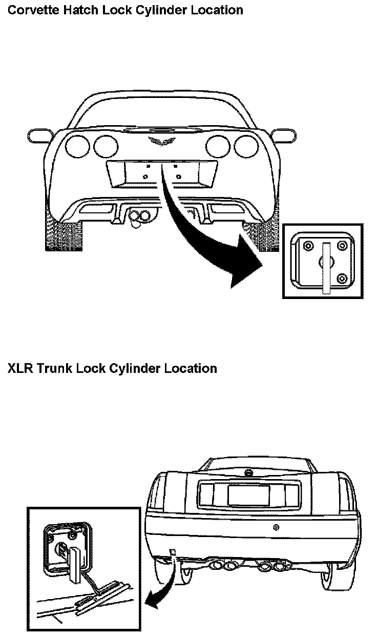 If interference is present, it may be difficult to passively enter the vehicle by squeezing the door handle switch. If this is the case, try pressing the unlock button on the fob. If the door still will not unlock and open, use the mechanical key to unlock the trunk/hatch. The rear key cylinder is located in the rear fascia for the XLR and directly above the license plate in the Corvette. Once the rear trunk/hatch is opened, there is a door release cable on the left side of the trunk interior. Pull this handle to pop the door open.