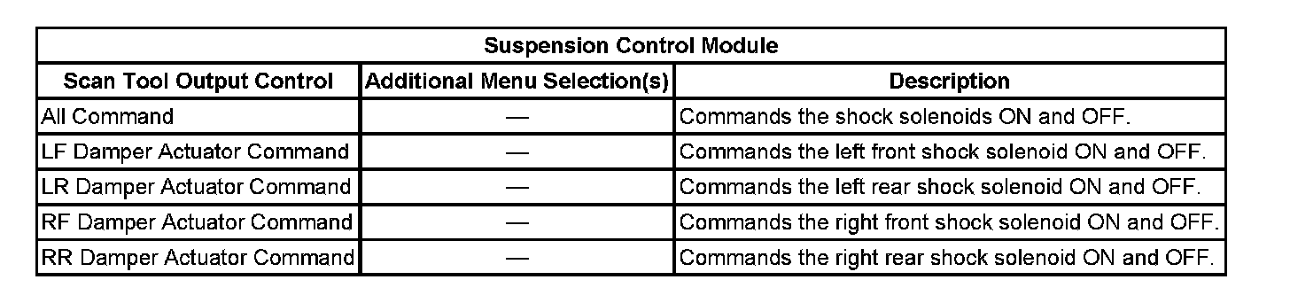A scan tool may be used in order to command the shock absorbers ON or OFF, without the need for input information from other components. This can be very helpful in determining if a certain portion of a circuit or a component is in working order. The table below lists the tests that are available for the electronic suspension control system. The tests are listed in alphabetical order.