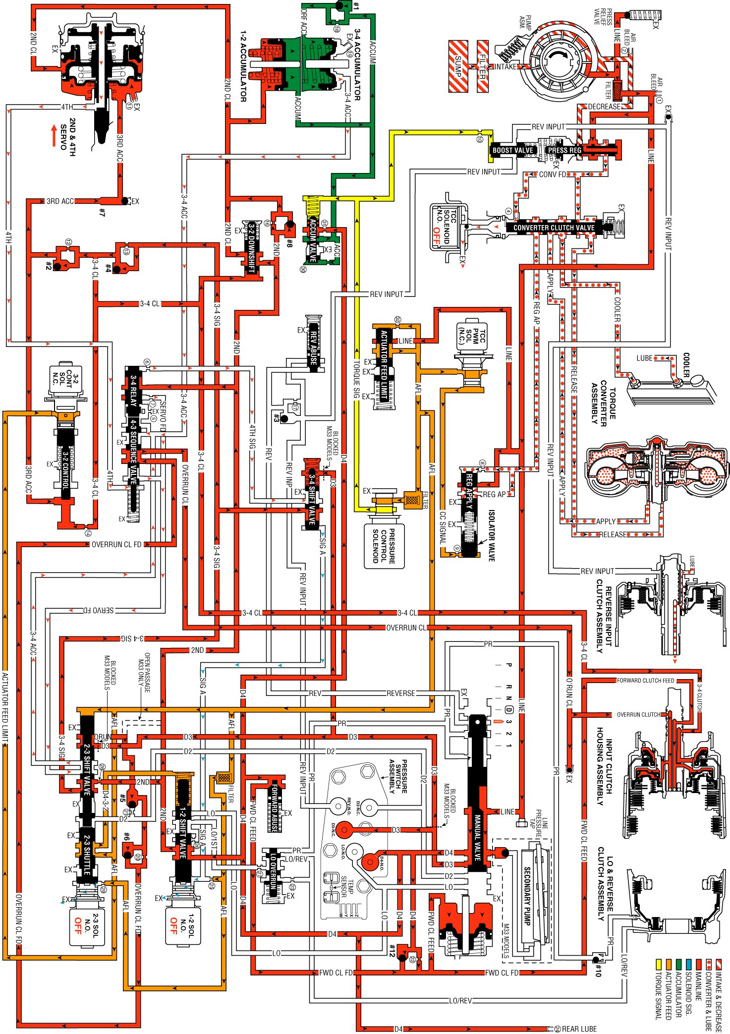 In D4 second gear, the 2-3 SS valve is energized and the 2-3 shift valve train is in the downshift position normally allowing overrun clutch circuit to exhaust. With the spacer plate redirecting the D2 oil, the overrun clutch can be applied.