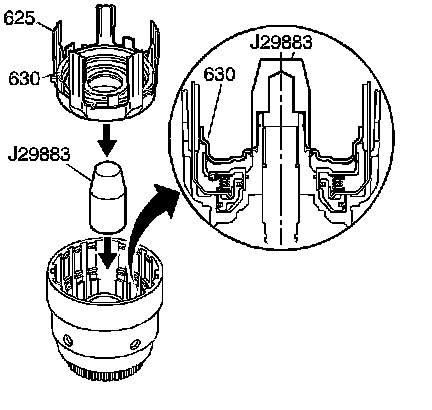 Important: The forward clutch piston (630) apply legs must be indexed with the 3rd and 4th clutch apply ring (625) legs.