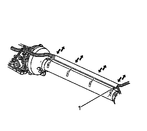 54. Carefully pull the wiring harness down into the L-shaped brackets along the driveline support assembly, align the harness retainer (locator) (1) to the hole in the forward bracket, then secure in place.