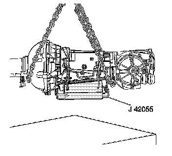 43. Release the J 42055 from the transmission, then remove the J 42055 and transmission jack.