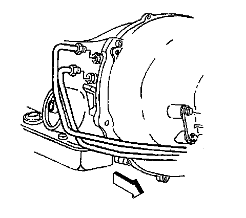 63. Disconnect the transmission oil cooler rear pipes from the fittings on the transmission, then cap the pipes and plug the transmission fittings to prevent contamination.