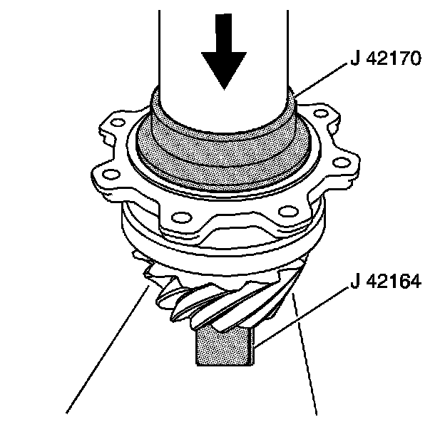 5. Press the bearing onto the pinion shaft using J 42170, J 42164, and a hydraulic press.