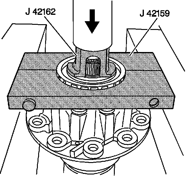 5. Using the J 42159, J 42162, and a hydraulic press, remove the right side bearing from the differential.