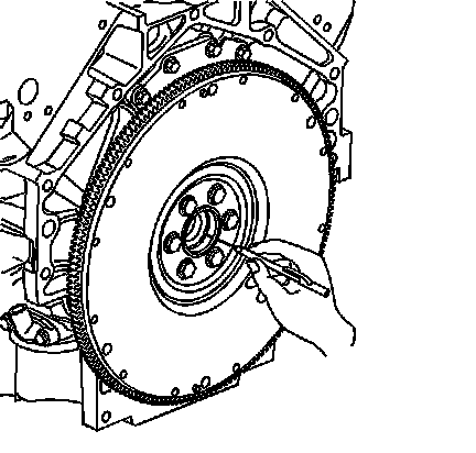 ^ For manual transmission applications, note the position and direction of the engine flywheel before removal. The flywheel does not use a locating pin for alignment. Mark or scribe the end of the crankshaft and the flywheel before component removal. The engine flywheel must be reinstalled to the original position and direction. The engine flywheel will not initially seat against the crankshaft flange, but will be pulled onto the crankshaft by the engine flywheel bolts. This procedure requires a 3 stage tightening process.