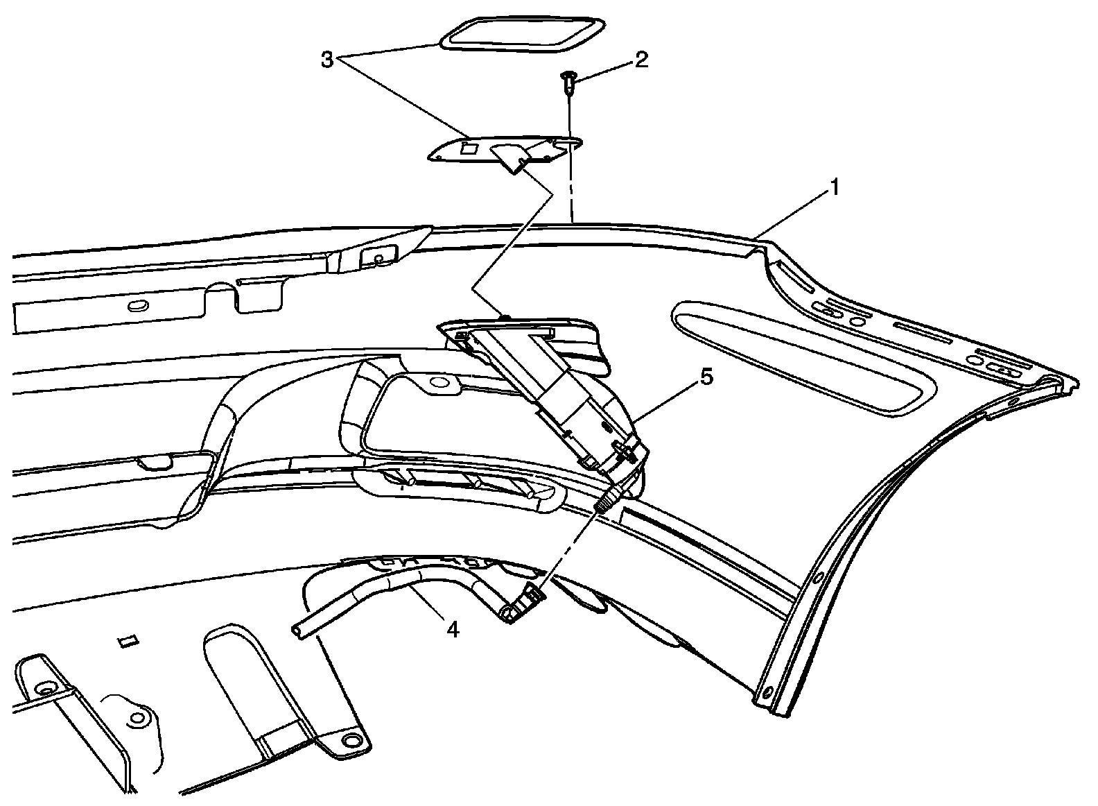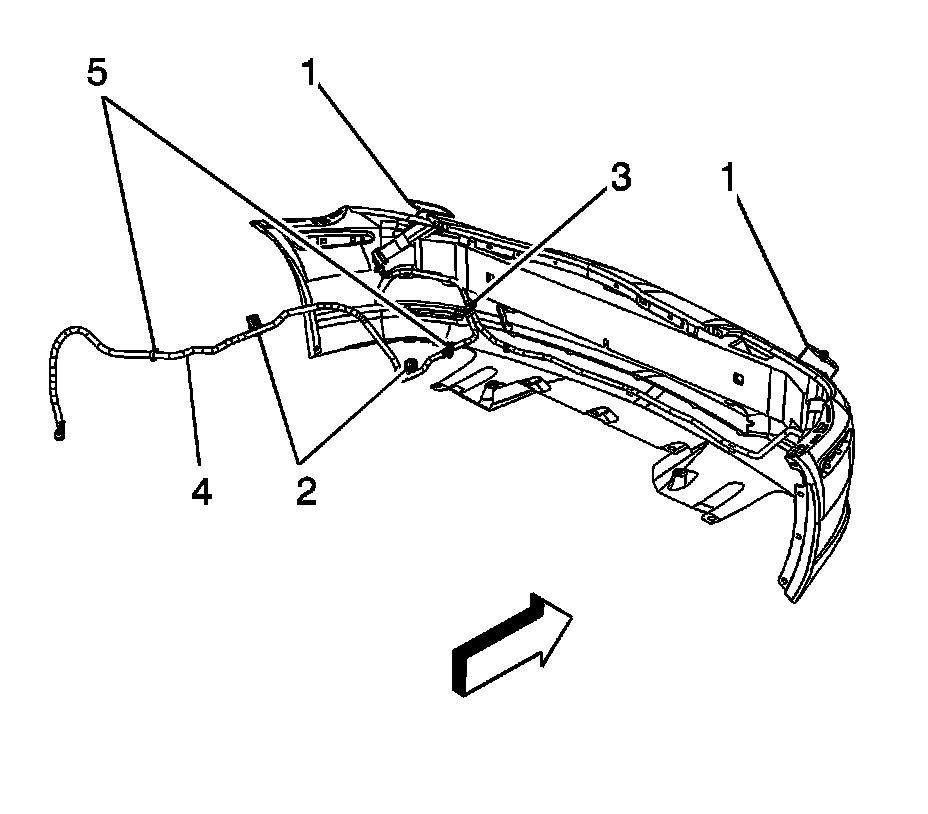 IMPORTANT: The headlamp washer hose consists of multiple sections (4), and slide-lock connectors (5), from the pump to the headlamp washers (1). It may be necessary to work underhood, or inside the front fascia to service the Tee fitting (3), and hose clips (2). If it is necessary to access the washer solvent container hose.